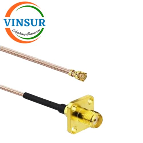 VSW-61423D404-14E — RF CABLE ASSEMBLY – 50 OHM , SMA FEMALE, STRAIGHT 4 HOLE FLANGE TO U.FL FEMALE, RIGHT ANGLE FOR RG178 CABLE OF LENGTH 14 INCH
